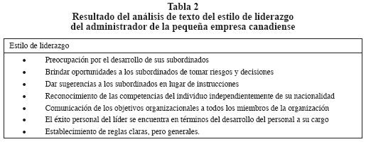 En relación con el estilo de liderazgo del emprendedor (tabla 2), el que generalmente utilizan los líderes de las organizaciones canadienses es el liderazgo transformador, como el descrito por Bass (1999) y Avolio (1999). Uno de los líderes de una empresa de consultoría comentó: