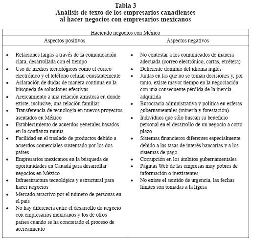 Los resultados del análisis de texto de las entrevistas sugieren que el escaneo del entorno es importante para que el empresario pueda tomar iniciativas de internacionalización; además, con ello se tendrá una visión clara de los objetivos y las fortalezas del negocio. El estilo de liderazgo generalmente mostrado por los administradores es inspirador y visionario como lo sugiere Bass (1999); la sensibilidad cultural de los empresarios canadienses es favorable hacia los empresarios mexicanos. Las relaciones de negocios exitosas se basan en el desarrollo de socios comerciales y se describen comportamientos que facilitan u obstaculizan la relación por parte de los empresarios mexicanos.