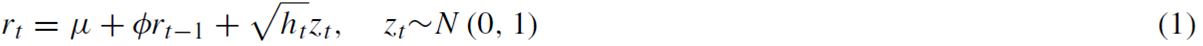 where μ is the conditional measure, h t expresses the conditional variance that depends on the last innovation of the square residues ε2 t−1 also known as the ARCH effect and the previous conditional variance h t-1 , ω is a deterministic term, and its function allows for the conditional variance to reach a positive level as long as the level of persistence determined by α + β is lower than 1. The term AR(1) or autoregressive of the 1st order is aggregated to the equation of the conditional measure, given that the present yields are highly correlated with the distant yields in time.