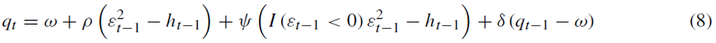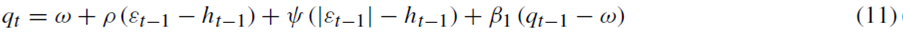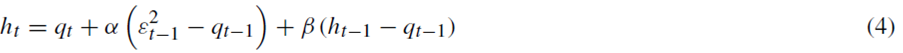 where h t indicates the short-term volatility level that captures innovations, fed through exogenous events related to economic, geopolitical and even speculative aspects, and which fluctuate in a cyclical manner; q t represents the long-term volatility or tendency, which converges at the level of the unconditional volatility ω to the velocity of (α+β) < δ < 1. The term (ε2 t−1 − h t−1 ) works as the dynamic power for the movements of the tendency and the difference between the conditional variance and its tendency, (h t-1 - q t-1 ) is the temporary component that converges to zero at a velocity (α + β).