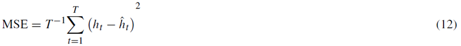 where T indicates the number of predictions, h t is a proxy variable for the no observable volatility, which is generally obtained from the square yields, and ĥ t is the estimated volatility through the different GARCH specifications.