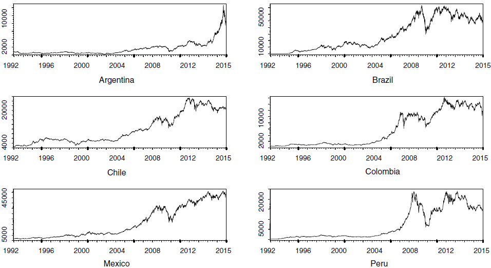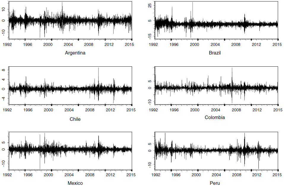 Even if the equity markets of the emerging countries are characterized by experiencing high volatility, effects of asymmetry and an elevated degree of persistence, their study has been concentrated in the temporal behavior of the characteristics common of volatility, and therefore there is the need for a study on the long-term effects of asymmetry and persistence on validity. This work investigates the long-term effect of asymmetry and persistence in the prediction of conditional volatility using the daily prices of the six most important equity markets of the Latin American region: Argentina, Brazil, Chile, Colombia, Peru and Mexico.7 The analysis covers the period from January 2nd, 1992, to December 31st, 2014, with a sample of approximately 5951 daily yields. The price series of the stock indexes were obtained from the Bloomberg database.