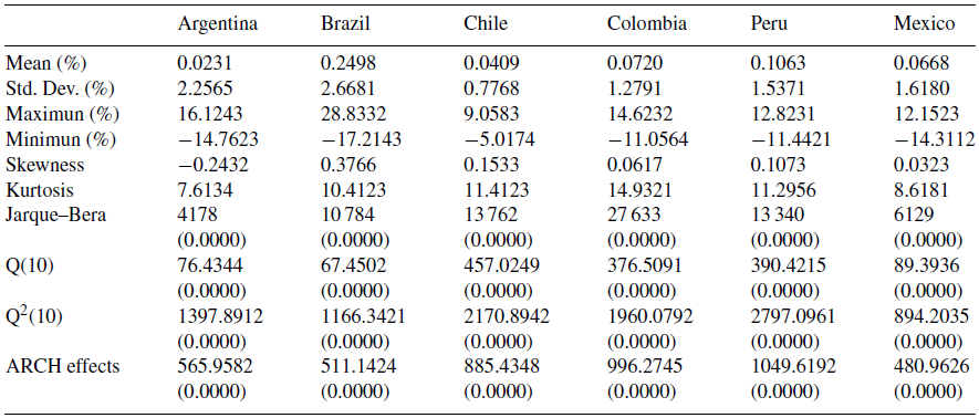 Notes: The descriptive statistics of Latin America equity market returns are expressed as percentages for the period from 2 January 1992 to 31 December 2014. The numbers in parentheses are p-values of Jarque-Bera, ARCH effect, and Ljung-Box statistic tests of the return and squared return series.