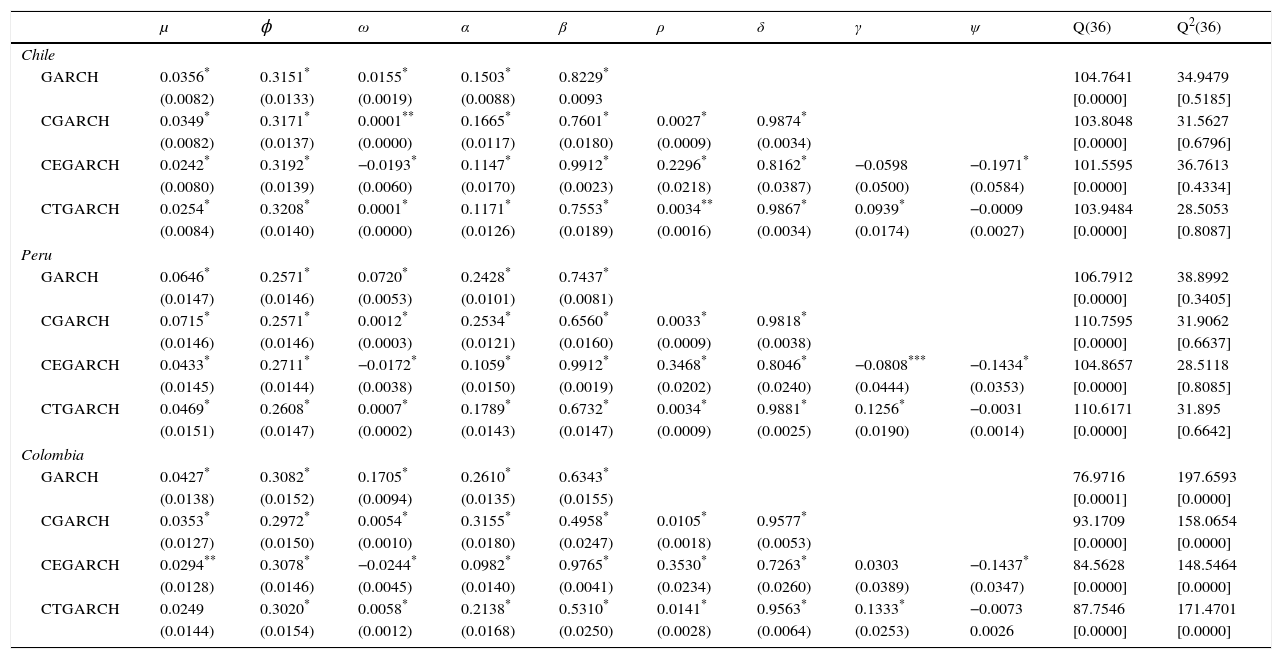 Table 3: Estimates of the volatility models for Chile, Colombia and Peru countries.