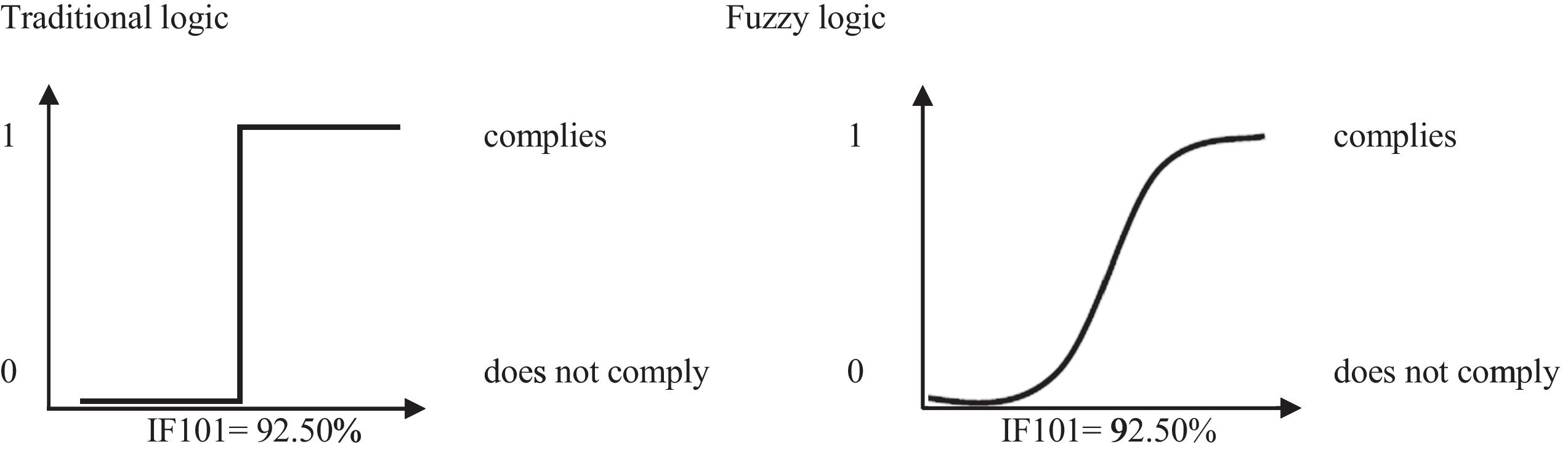 Figure 1 describes the interpretation of information for traditional logic and fuzzy logic, allowing to observe the strong change in the transition curve between the proposed ranges. The search for order within chaos leads to bifurcation, however, fuzzy logic produces a symmetry rupture point that has a traditional geometry in fractal terms that describes a geometric object, with wide scale ranges (Gil, 2000, 2005). This means that it emphasizes the blurriness of the variables, particularly on the everyday and corporate bases due to the dissonance with reality (Restrepo & Vanegas, 2015).