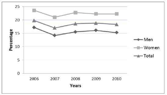 Figure 1 shows the evolution of overqualification in Spain for the 2006-2010 period according to gender. We can observe that overqualification is higher for women than it is for men for all years. In the year prior to the onset of the crisis (2007) there was a drop of around 2-3% in overall overqualification if compared to 2006, figures that will rise again the following year with the onset of the crisis. Of the following years, 2009 shows the highest figures of overqualification, except for women. We cannot advance in this study in later years because the Quality of life at work survey ends in 2010.