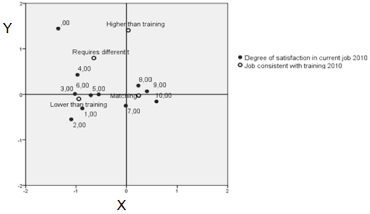 The methodology used in this work is diverse: with an independence contrast we tried to find whether the variables Degree of satisfaction with the current job and position (according to whether or not it is in accordance with the level of training) are independent, subsequently calculating association coefficients; through an analysis of correspondence we will graphically observe the associations between the categories of both variables; we calculated a ordinal logistic regression, with the dependent variable being the degree of job satisfaction and the independent variable being the job position. Finally, we will review the mean figures of job satisfaction before the crisis (2007) and during it (2009 and 2010) to assess whether the crisis has affected this indicator (at the general level and in function of the job position).