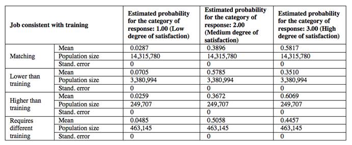 In Table 7 we calculated the estimated probabilities for each of the cases, that is, if the job position is correct, if it is lower than the level of training, if it is above the level of training, and if it needs different training. As can be observed, if the job position is lower than the level of training (overqualification), the estimated probability for the medium degree of satisfaction is of 57.85%. If we compare this figure with the percentages of Table 1, when the degree of satisfaction is equal to 4, 5, 6 and 7 (non-transformed variable) it provides a value of 57.5%; therefore, the model reproduces the data summarized in the contingency table very well. According to Table 7, if the workers are overqualified, the degree of job satisfaction is estimated to be 7.05%, 57.85% and 35.10%, depending on whether satisfaction is classified as low, medium or high, respectively. However, if the workers occupy a job commensurate with their training, the estimated probabilities are of 2.87%, 38.96% and 58.17%, respectively. It can also be observed that if the job position is correct, the highest estimated probability (58.17%) corresponds to the high degree of satisfaction, whereby, the direct consequence is the following: overqualified workers have a lower degree of satisfaction than those whose job position is adequate to their training. We have reached this conclusion in both the ordinal regression and the graphical study of the correspondence analysis.