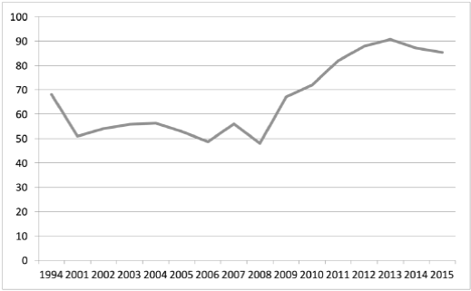 Figure 6 State Debt/SGDP greater to the National Average, 1994, 2001-2015 Percentage