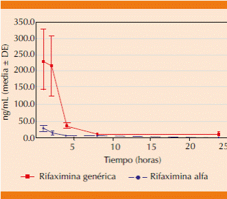 Figura 2 Concentraciones plasmáticas de rifaximina después de la administración de 100 mg/kg de rifaximina genérica y de rifaximina de referencia (alfa).
