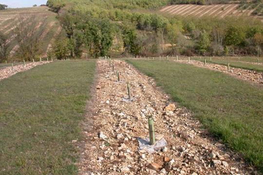 The truffle cultivation in calcareous lawn or "Tanguy" model (Figure 4) was defined after two rainy summers, 1992 and 1993 (Sourzat, 1995), followed by two exceptional harvests in the Tarn-et-Garonne (at the plantation of the initiator of this model), the Périgord (two producers), the Lot department (one producer) at Miers, Bouat and Meynard, respectively, and the Vaucluse (one producer in Pina, Apt). Other truffle growers then reinforced the perception of this model of truffle cultivation with their plantations following a similar technical itinerary. The peculiarity of this model is the planting of mycorrhized trees followed by a natural recolonization of the environment by herbaceous vegetation. In the plantations used to define this model, tillage was stopped as well as any intervention on soil two to three years after planting. It was only after the beginning of production that the truffle growers again took interest in cultivating the planted site. The first harvests took place from 10 to 12 years. In some plantations, tillage has been more or less used; in others, it was enough to mow the lawn. Among the herbaceous vegetation characteristic of these sites, grasses, particularly Bromus erectus Huds., Festuca ovina L. and Elymus repens L., are present. The ecological characteristics of these truffles close to those of the natural environment have made it possible to reformulate the "Tanguy" model as "calcareous lawn truffle cultivation" (Sourzat, 2002). This model generally offers production levels (up to 100 kg / ha) similar to those of the late nineteenth or early twentieth century. On the other hand, truffles are frequently on the surface, presenting a sensitivity to frost, insects and slugs. Solutions have been sought and implemented to remedy these difficulties. It should be noted that the growth of trees is retarded by grass competition: if the lawn protects against fungal contamination, it delays the beginning of truffle production. In the absence of a fungal contamination pressure, in particular by Tuber brumale, this model is not justified (Sourzat and Tabouret, 2008).