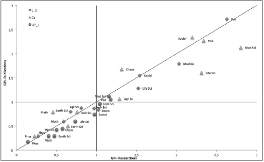Finally, the relational chart in Figure 3 presents the ten most productive fields for each of the three professional grades. The abscissa axis shows the GPI-r values and the ordinate axis shows the PPI-p values for the fields selected. Additionally, two axes have been marked at GPI=1 to differentiate those fields in which women are majority and in which their output is higher or lower than that of their male counterparts. The 45° line acts as a gender success boundary: the fields above it are those in which women exhibit greater success; and those below correspond to fields in which male researchers are most successful. Figure 3 shows women are more successful at the grade of Candidate (Ca). This is also true in the fields of Physics (Phys), Mathematics (Math), Chemistry (Chem) and Sociology (Sociol). Women at the grade of L_1 are more successful in the fields of Pediatrics (Ped), Agricultural Science (Agr Sci) and Earth Sciences (Earth Sci). With the exception of the field of Physics, which is shown practically atop the 45° boundary, there is no field in which women are more successful than men at the highest profession grade (Up_L).