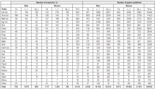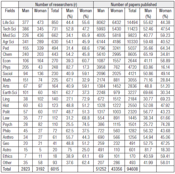 An analysis of the presence of women researchers and their scientific output in each of the fields considered in terms of professional grade reveals that at the Candidate grade (Ca) women constitute majorities in 15 of the 22 fields, while men lead in the remaining seven, i.e., Technological Sciences (Tech Sci), Physics (Phys), Mathematics (Math), Earth Sciences (Earth Sci), Anthropology (Anthro), Astrophysics (Astro) and Ethics.