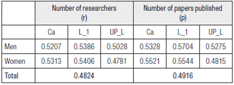 The analysis of data by gender of the number of researchers and papers published against the professional grade is shown in Table 2. Said table shows in general terms that women researchers have a larger presence at the lower professional grade levels, such as L_1 and el Candidate (Ca), representing 22.1% and 18.57%, respectively, of the total number researchers, while male researchers are represented in the higher levels (Up_L) at 16.37% of the total. Other research has obtained similar results, showing a presence of women researchers higher than that of male counterparts in the lowest professional grade levels, and lower presence in the higher levels (Abramo, D'Angelo y Caprasecca, 2009; Mauleón y Bordons, 2006; Mauleón, Bordons y Oppenheim, 2008; Caputo, Requena y Vargas, 2012). In terms of scientific output of female researchers, this value came in higher at the highest professional levels (Up_L), at 22.6% of the papers published by women. Male researchers also boast higher scientific output at the highest level (Up_L), at 34.79% papers published by men, and at a proportion much higher than seen in women researchers.