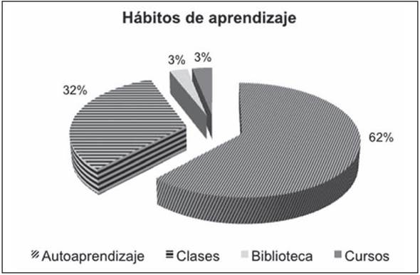 Un análisis de las frecuencias en la tercera dimensión (hábitos de aprendizaje) de las variables o ítems también proporciona información relevante para la investigación. La Figura 1 muestra las proporciones de las cuatro categorías principales de hábitos de aprendizaje: el autoaprendizaje, clases, biblioteca y cursos. El autoaprendizaje y las clases fueron particularmente significativas entre la población encuestada; sin embargo, la biblioteca, considerada como un hábito de aprendizaje, es mucho menos relevante.