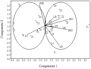 Las variables asociadas de forma importante al CP1 fueron PSV y PSN; variables asociadas al CP2, fueron NN y PSR. En la Figura 1 y del lado positivo del CP1, se observa un grupo de vectores-variable conformado por LR, CL, PSV, NT y PSN, por el ángulo agudo formado por sus líneas, se puede afirmar que muestran correlación positiva alta. La figura muestra también que las variables NN, PSN y PSV estuvieron bien representadas, NT y LR mal representadas y que la variable LV fue poco relevante en este estudio.