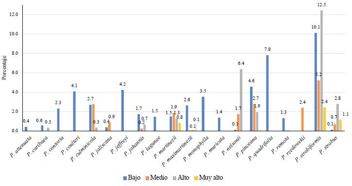 Respecto a la distribución de los pinos en áreas de conservación, por orden de importancia, resultaron los siguientes: P. strobiformis (Durango, Chihuahua, Coahuila, Nuevo León) con más de 20%; P. culminicola (Nuevo León, Coahuila) con casi 15%; P. pinceana (San Luis Potosí, Querétaro, Coahuila), P. maximartinezii (Zacatecas), P. coultier (Baja California), P. strobus (Chiapas, Oaxaca, Veracruz), P. contorta (Baja California) y P. quadrifolia (Baja California) entre 5 y 10%; otras especies, tales como P. nelsonii (San Luis Potosí, Tamaulipas, Nuevo León) y P. martinezii (Durango, Chihuahua, Jalisco) fueron menores al 5% (Figura 3)