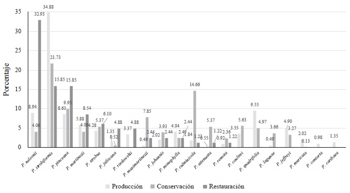 En relación con la zonificación forestal, los resultados indican que 100% de las especies bajo estudio se encuentra en menor o mayor porcentaje en áreas de producción, 85% se ubican en espacios de conservación y 65% zonas asignadas a la restauración. Las especies ubicadas en las áreas de producción, por mencionar algunas por su importancia porcentual, se encuentran P. strobiformis, P. quadrifolia, P. nelsonii, P. pinceana y P. martinezii; en áreas de conservación están P. strobiformis, P. culminicola, P. pinceana, P. maximartinezii, P. coulteri y P. attenuata y en zonas de restauración son P. nelsonii, P. strobiformis, P. pinceana, P. martinezii, P. strobus y P. jaliscana. Los taxa que se ubican en las tres zonas y por importancia proporcional son P. nelsonii, P. strobiformis, P. pinceana y P. martinezii.