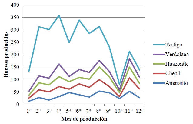 García-Hernández et al. (2017) encontraron que el pastoreo de quelites suplementado con maíz azul afecta significativamente (P > 0.05) la producción anual de huevo respecto a lo que producen las gallinas con alimento comercial (Figura 1). Las gallinas alimentadas con amaranto produjeron 2.79 huevo mes-1, mientras que las que pastorearon chepil, huazontle y verdolaga produjeron 2.65 huevo mes-1, 2.56 huevo mes-1, 2.22 huevo mes-1 respectivamente, estos valores fueron estadísticamente diferentes a la producción de 10.46 huevo mes-1 que se reportó para gallinas con régimen de alimentación comercial.