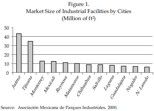 As stated before, the adoption of the bip program in the late 1960s was the inflection point towards a new economic regime in Ciudad Juárez. By the 1980s, Mexico shifted its development strategy from an import substitution model to an export led model where maquiladoras play a very important role. As a consequence of these economic policies, the city experienced broad-based industrial change as the number of maquiladoras expanded. Based on historical data, about 17 square meters of space are needed to accommodate each additional job in the maquiladora industry (AMPI, 2000). In Ciudad Juárez the real estate market for industrial facilities is estimated at about 4 million square meters of space, making of this city one of the largest markets of industrial facilities in the country (Figure 1).
