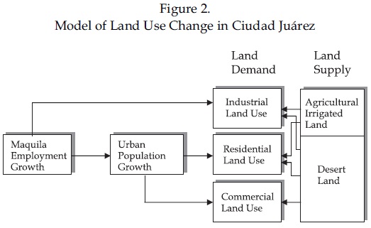 The analysis of land use change revolves around two central and interrelated questions: What drives/causes land use change? What are the environmental and socio-economic impacts of land change? The socio-economic drivers comprise demographic, social, economic, political and institutional factors and processes such as population and population change, property rights, etc. in this context, Ciudad Juárez faces serious challenges posed by faster demographic and economic growth. In its struggle to respond to urban land development pressures, local institutions, both public and private, are overwhelmed by a multitude of concerns.