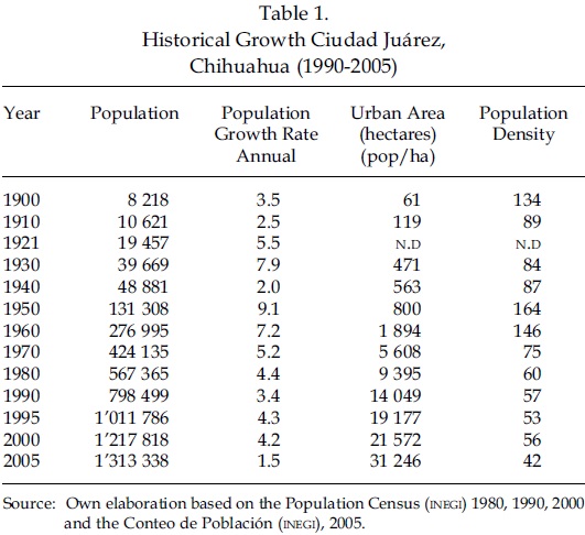 After the Mexican Revolution of 1910, the city began to experience population pressures as a result of immigration flows from central Mexico. By 1921, the population of Ciudad Juárez was growing at an annual rate of 5.5% and reached a population of almost 20,000 inhabitants. in the next decade the population nearly doubled and the urban area encompassed 471 hectares.1 During the 1930s the density fell from 482 to 85 inhabitants per hectare. In the 1940s, these indicators slowed their pace. Ciudad Juárez's population growth average annual rate was only 2.0% and the urban area increased only by an additional 92 hectares (Fuentes, 2000).