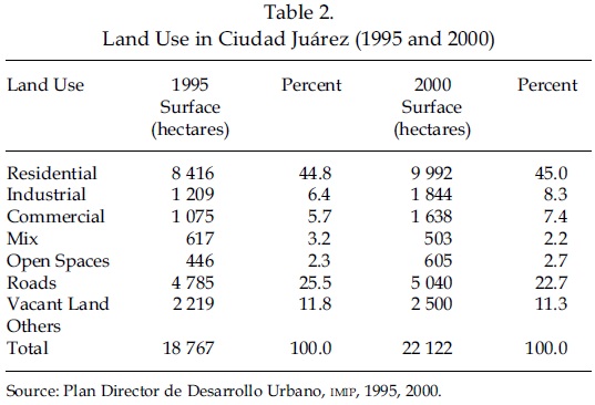 Table 2 shows that in relative terms the residential use of land has comprised a similar proportion since 1995. However, industrial land use has increased its proportion from 6.44% in 1995 to 8.34% in 2001; the commerce and service land area has increased from 5.7% to 7.40 percent.