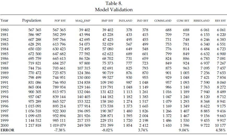 The model was validated against real data from 1980 to 2000. The results are presented in Table 8, where the real and estimated data are shown for the five key variables in the model -population, maquiladora employment, and industrial, residential, and commercial land uses.