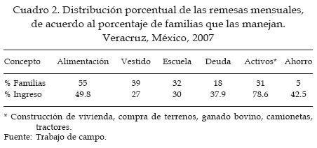 Para el caso de Veracruz, el cuadro 2 muestra el destino de las remesas que envían los migrantes a sus familias; se puede ver que aunque la mayor parte de las familias (55%) orientan un porcentaje alto a la alimentación familiar (49.8%), otro grupo (31%) destina al menos 78.6% en promedio de las remesas recibidas a la compra de activos, donde destaca la construcción de la vivienda con materiales duraderos como concreto, así como la adquisición de semovientes, vehículos para trabajo, terrenos para cultivo, potreros, bombas de agua o de energía, etcétera.