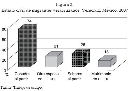 De esta manera, podemos aseverar que la dinámica social que se va creando genera un modelo de familia que no necesariamente es distinto al tradicional, ni rompe con los patrones hegemónicos patrilineales de la familia mesoamericana, descrita por Robichaux (1997 y 2002) y Pauli (2002), y cuya prevalencia en Veracruz Central fue analizada por Del Ángel y Mendoza (2002). A pesar de que se trastocan muchas de las prácticas cotidianas, perviven los grupos familiares extensos con sistemas de herencia patrilineales de la tierra, residencia y jerarquías masculinas. Dentro de la reproducción de los roles masculinos, también fue notable el ejercicio de la libertad tradicional de los varones, en oposición a la restringida libertad de las mujeres para la formación de nuevos hogares, ya que los varones toman concubinas o esposas en los Estados Unidos, con pleno conocimiento de su grupo familiar. Al momento de realizar esta investigación, el estado civil de los migrantes (figura 3) mostró que del total de los varones que al partir estaban casados en Veracruz, 21% formó un nuevo hogar en los Estados Unidos, mientras que en los casos de aquellos que eran solteros al momento de abandonar el país, 50% formó una familia; en todos los casos la unión se llevó a cabo con mujeres migrantes indocumentadas mexicanas, en su mayor parte veracruzanas. La formación de una nueva familia en los Estados Unidos se llevó a cabo en un promedio de cuatro años después de haber salido de México; los comentarios de los varones que han retornado mostraron que la formación de un nuevo hogar en los Estados Unidos se debió también a la reproducción de las formas de vida de sus lugares de origen y a la adaptación al lugar.