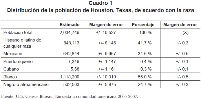 De acuerdo con el censo de población de Estados Unidos 30% de los habitantes de la ciudad de Houston, Texas, es de origen mexicano. De los dos millones de habitantes, 640 mil son mexicanos. El siguiente grupo nacional hispanoamericano de acuerdo con su peso poblacional en Houston son los puertorriqueños con siete mil habitantes (US Census Bureau, 2007).