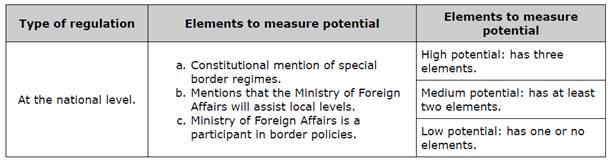 Here, we are interested in determining which countries offer their local border authorities the greatest ability to project themselves internationally so that the actors can both recognize the options provided by the legal system and build a strategy for achieving cross-border integration. Thus, the measurement of potential will be based on the indicators set forth in tables 1, 2 and 3.