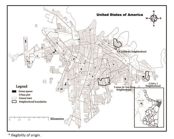 Figure 1: Distribution of the green spaces in Matamoros, Tamaulipas and in the neighborhoods considered for the study