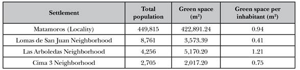 Table 1: Green spaces per inhabitant in Matamoros, Tamaulipas, 2010