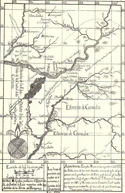 2At that time, the Guaraní reductions comprised a complex of thirty towns located on what are now the borders of Paraguay, Brazil, Argentina and Uruguay. Around the date of the expulsion, they were populated by 90 000 people in a zone that was historically disputed with the Portuguese in Brazil, located on roads and waterways connected to the principal ports and markets of the Río de la Plata region.