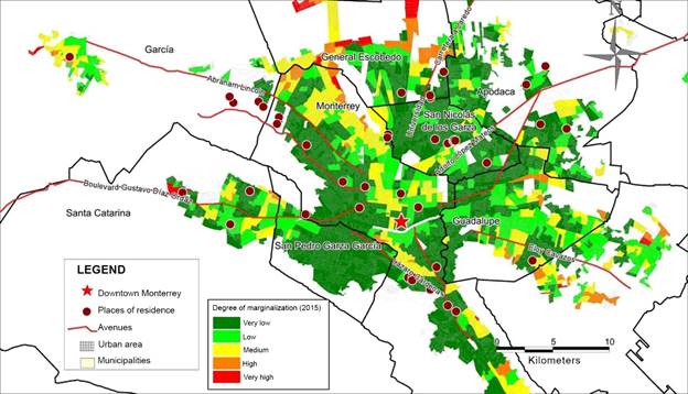 The pandemic reveals that privileged people─with access to technologies for virtual conversations─were interviewed. Venezuelans arriving in the MMA adapt to changing labor and economic circumstances. The marginalization maps show that the socio-spatial condition is not a vulnerability; Venezuelans inhabit socially privileged spaces, close to their support networks and communication routes that allow them to have the advantages of the metropolitan center. A settlement pattern was found in the peripheral zones, mostly to the northwest of Monterrey, adjacent to García, in the area known as Cumbres. This is where 24% of those interviewed live.