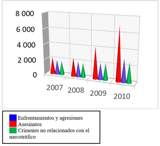 Es interesante señalar que en 2009 hubo seis veces más muertes por delitos de narcotráfico que en 2005. El número de muertes causadas por el crimen organizado y el narcotráfico aumentó de 1 573 en 2005, a 2 221 en 2006, 2 673 en 2007, 5 630 en 2008 y 7 724 en 2009 (Gutiérrez et al., 2010; Escalante Gonzalbo, 2011).