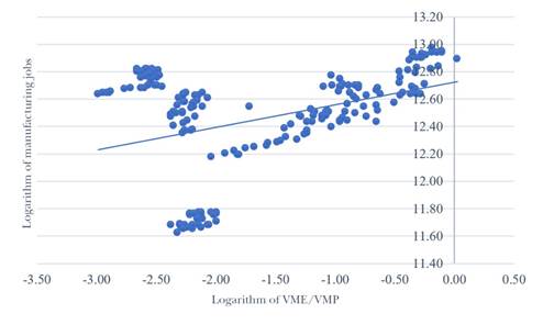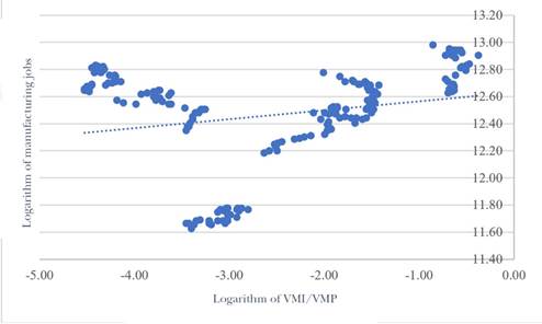 However, the model that was estimated for the manufacturing sector in the northern border region indicated positive and significant coefficients for both export and import penetration. The above results suggest that the growth in manufacturing jobs is significantly linked to foreign trade in this sector in this border region. The importance of foreign trade in the dynamics of manufacturing jobs can be explained by the development of global supply chains and the fragmentation of production processes, which led to a significant increase in maquiladora and export manufacturing establishments in the northern border region of Mexico. In addition, the results of the estimations indicate that the coefficient of manufacturing wages was negative, suggesting that the low wages paid to workers in the maquiladora and export manufacturing industry could be a limitation for the manufacturing trade in generating multiplier effects in total economic activity and, therefore, for employment in other economic activities in the northern border region of Mexico.