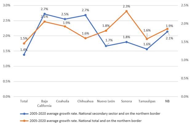 In addition, for the manufacturing sector, the difference between growth rates is even greater in the border region. The average annual growth rate in the same period for the secondary sector nationally was 1.5%, and the growth rate for the northern border states was 2.1% (Figure 1). Employment patterns along the northern border suggest the existence of factors that have had a greater impact in that region than in the rest of the country. Furthermore, when analysing the growth rates of the total employed population and the secondary sector at the national level and in the border region, each of the border states saw a total growth rate and manufacturing sector growth rate that were higher than the national level for the reference period. In particular, the cases of the states of Baja California, Chihuahua and Sonora stand out.