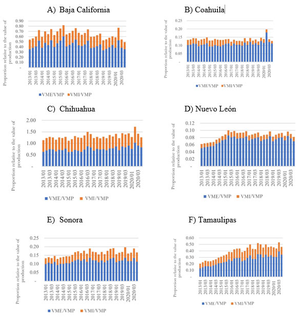 The export manufacturing industry has become a fundamental sector of the economy of the northern border region, both for its weight in total exports and for its contribution to the generation of labor. However, the employment growth rate has not been as dynamic relative to the overall economic activity of the country (Tavares Luna & Varela Llamas, 2019). In this regard, it has been argued that the growth of the manufacturing sector in Mexico has not been a decisive factor in increasing formal employment because the relative importance of this sector in the total economic activity is lower than that of the service sector (Almonte et al., 2020). However, some studies have found, based on input-output matrices, that manufacturing exports have a positive impact on production and employment (Ruiz Napoles, 2017).
