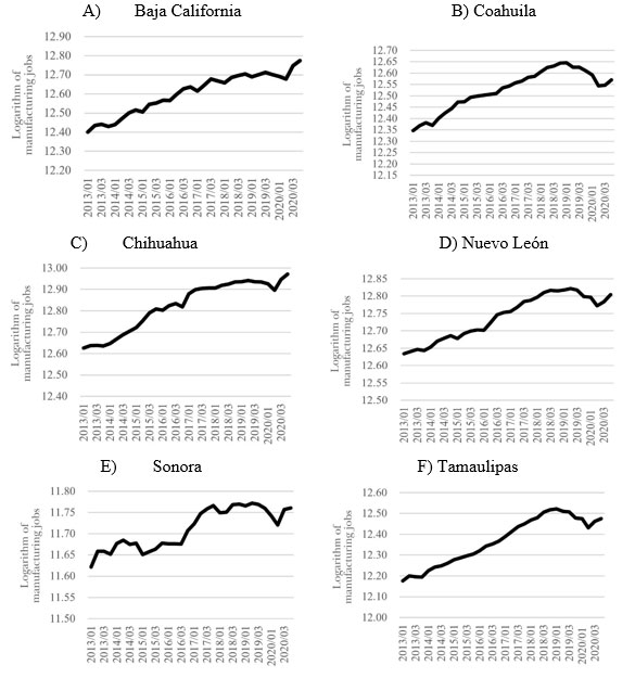 Manufacturing activities in which high levels of foreign direct investment (FDI) are concentrated show significant growth in employment for both skilled and unskilled workers (Saucedo et al., 2020). Regionally, the economies of the border states of Mexico and the USA, particularly those of border states such as California and Texas, have experienced an increase in trade integration. This has led to employment trends in the northern Mexican border region showing greater synchronization with employment trends in the United States (Mendoza, 2009). Thus, the growth of employment in the northern border region of Mexico has been concentrated in the service, manufacturing and trade sectors (Grijalva Monteverde, 2004). In particular, the states on the northern border of Mexico have had sustained growth in manufacturing jobs derived from their proximity to the United States and the boost from NAFTA. Employment concentrated in the transportation and electronics industries stand out (Angoa et al., 2009).