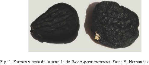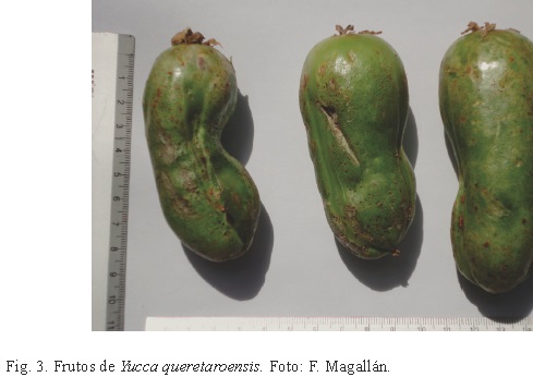 Discusión. Yucca queretaroensis fue descubierta y descrita en 1989 por Ignacio Piña, de una localidad en el municipio de Pinal de Amoles, Querétaro, México, por lo que la consideró una especie endémica del estado. En su descripción se omitieron las características del fruto y de las semillas debido a que no fueron observadas y el autor se basó en las hojas, flores y hábitat para ubicarla dentro de la serie Rupicolae, sección Chaenocarpa (Piña, 1989). Posteriormente, Piña (1990) mencionó nuevas localidades de distribución en Querétaro e Hidalgo, anexó la foto de un ejemplar de herbario y aportó datos de medidas del fruto y las semillas, sin mencionar el tipo de fruto y dehiscencia. Tampoco discutió una posible reubicación de la especie en otra sección del género.