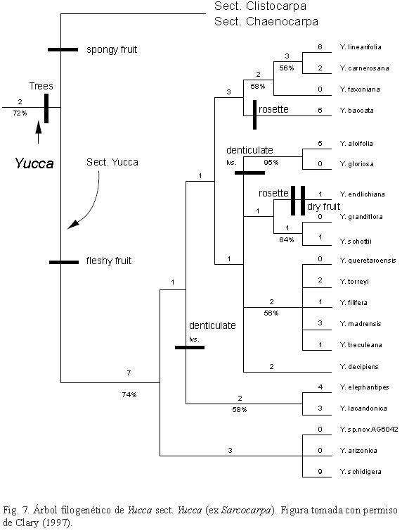 Si se compara la clasificación tradicional del género (McKelvey, 1938, 1947), basada en caracteres morfológicos, se observa que de manera amplia concuerda con los diseños de filogenia propuestos en tres publicaciones, especialmente en la sección Yucca (ex Sarcocarpa), que es un grupo monofilético. Tomando en cuenta este aspecto, se considera que la actual propuesta está adecuadamente sustentada, dado que se basa tanto en la revisión de caracteres morfológicos, como en lo que se sabe acerca de la filogenia de los componentes del género.