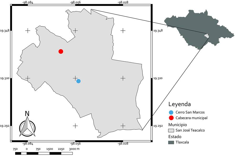 El sitio de registro es el cerro San Marcos localizado a 2750 m s.n.m., se sitúa en el municipio San José Teacalco, estado de Tlaxcala, México, dentro del polígono del Parque Nacional La Malinche (Fig. 2). La vegetación predominante es de bosque de Quercus-Pinus. Presenta clima templado subhúmedo con lluvias en verano; temperatura media anual entre 11 y 17 C (INEGI, 1986). En la población de G. purpusii se colectó material botánico (Fig. 3), se calculó el área que ocupaba y se monitoreó mensualmente entre febrero y septiembre 2019, para registrar el desarrollo de las hojas, de la inflorescencia y la apertura de flores. Para calcular la densidad poblacional se utilizaron cuadros armados con tubería PVC de 1 × 1 m, los cuales se colocaron en posiciones aleatorizadas en el área de distribución de G. purpusii, se contó el número de plantas por m2 en nueve cuadros.