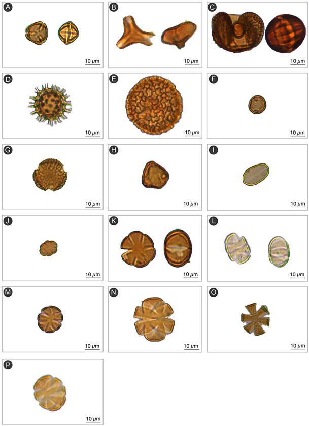 Figure 3: Light microscope micrographs of different taxa pollen grains. A-C and K-L, polar and equatorial views; D-J and M-P, polar view. A. Caesalpinioideae (Leguminosae); B. Psittacanthinae (Loranthaceae); C. Pinus sp. (Pinaceae); D. Convolvulaceae or Malvaceae; E. Nyctaginaceae; F. Campanulaceae; G. Acanthaceae; H. Onagraceae; I. Dioscoreales; J. Salvia sp. 1 (Lamiaceae); K. Nepetoideae (Lamiaceae); L. Salvia sp. 2 (Lamiaceae); M. Salvia sp. 3 (Lamiaceae); N. Salvia sp. 4 (Lamiaceae); O. Salvia sp. 5 (Lamiaceae); P. Salvia sp. 6 (Lamiaceae). Photos: Castro, M. (2019-2020).