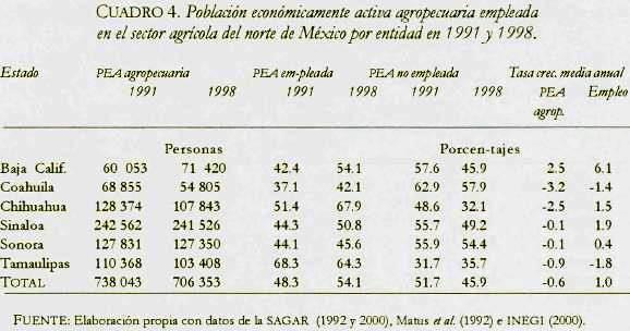En Baja California aumentó la capacidad de absorber mano de obra debido a que el empleo creció más rápido (6.1% anual) que la PEA agropecuaria (2.5% anual). Los estados de Chihuahua, Sinaloa y Sonora aumentaron su capacidad de absorber mano de obra debido a la disminución de la PEA y a moderados incrementos en el empleo. Coahuila aumentó su capacidad porque la PEA disminuyó más rápido que el empleo, en tanto que Tamaulipas disminuyó su capacidad de absorción debido a que el descenso del empleo en 1.8 por ciento anual superó la caída de la PEA, que decreció a un nono anual de 0.9 por ciento (cuadro 4).