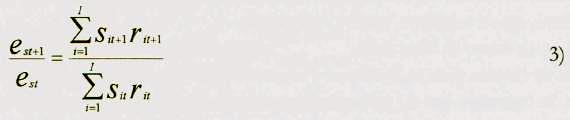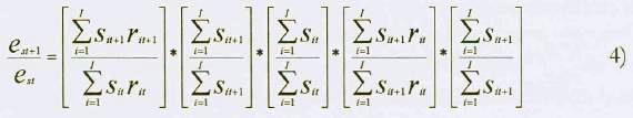 donde - significa tasa de crecimiento discreta, es es la tasa de crecimiento del empleo en la región s del año t al año t+1, cs es la tasa de crecimiento del empleo por efecto de un cambio en la estructura productiva, ss es la tasa de crecimiento de la superficie cosechada y ms es la tasa de crecimiento de los requerimientos de mano de obra. Cuando los requerimientos de mano de obra del año t son usados para determinar el empleo de mano de obra en t y t+1, bajo el supuesto de que los requerimientos no han cambiado significativamente de t a t+1, ms toma el valor de cero; de ahí que el "efecto mecanización" no se puede determinar. Si éste es el caso, se despeja es para obtener las fuentes de crecimiento del empleo de mano de obra en el sector agrícola: