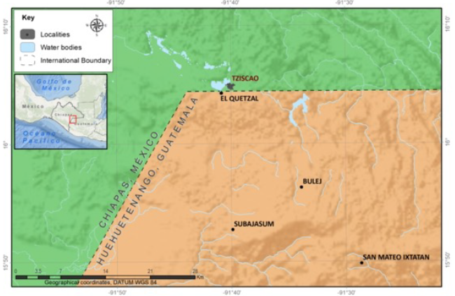 The municipalities of Tziscao, located in the southeast part of Chiapas, and El Quetzal, in the northwest part of the department of Huehuetenango, share a stretch of the border between Mexico and Guatemala near the Vértice de Santiago (See map 1). Abundant water characterizes this geographical area; it is home to the Montebello Lagoon System, composed of 59 water bodies, most of them on the Mexican side, and part of a lagoon on the Guatemalan side; this aquifer is called the Binational Lagoon, and it is divided by the geopolitical frontier.