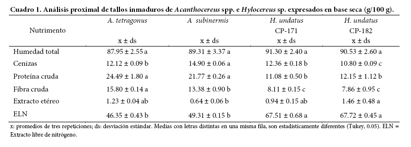 Al comparar los resultados del análisis proximal de A. tetragonus, A. subinermis y H. undatus con los encontrados en cladodios tiernos de nopal (Opuntia spp.) por Stintzing y Carle (2005), Guzmán y Chávez (2007), Rodríguez-García et al. (2007), Ramírez-Tobías et al. (2007) y Hernández-Urbiola et al. (2010), se encontró que en todos los casos la composición proximal fue similar, lo que sugiere que estos tres materiales estudiados son similares en sus cualidades nutrimentales y que los tres constituyen una alternativa alimenticia.