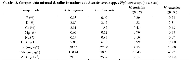 Los minerales tienen numerosas funciones en el organismo humano, como mantener la presión osmótica, formar parte de la estructura de muchos tejidos, ser constituyentes esenciales de ciertas hormonas y regular los latidos cardíacos (Latham, 2002). En este caso, A. tetragonus, A. subinermis y H. undatus (CP-171y CP-182) tuvieron altos contenidos de P, K, Mg, Na y Cu. Las especies A. tetragonus y A. subinermis destacan por su elevado contenido en Ca; los genotipos de H. undatus (CP-171y CP-182) sobresalieron por su contenido de K y Zn, respectivamente (Cuadro 2).